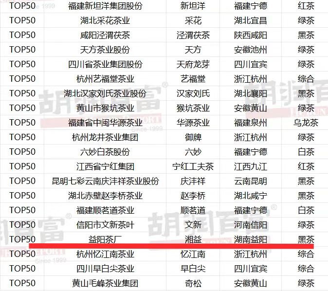 益陽(yáng)茶廠(chǎng)有限公司再度榮登《胡潤中國茶葉領(lǐng)域典范企業(yè)榜》